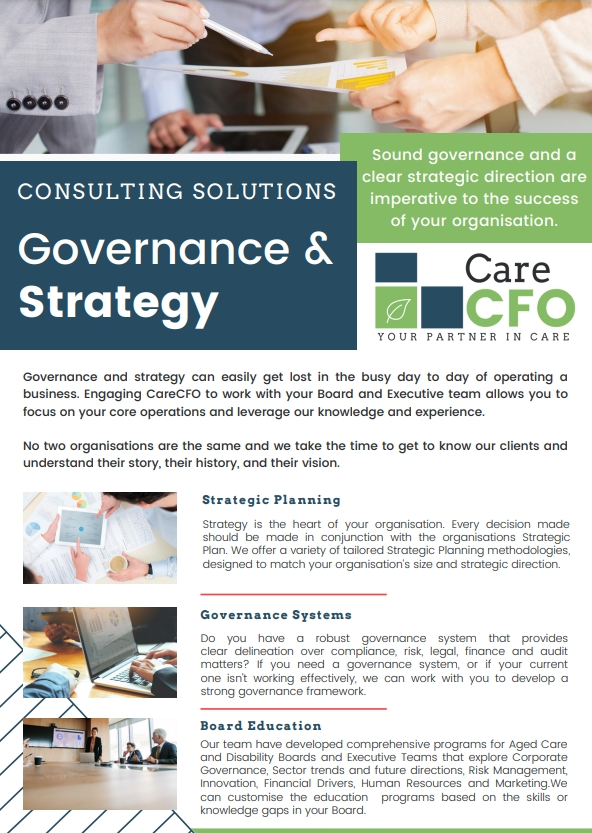 Engaging CareCFO to work with your Board and Executive team allows you to focus on your core operations, whilst leverage our knowledge and experience.