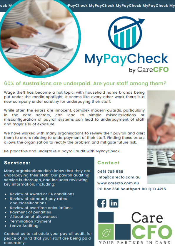 While often the errors are innocent, complex modern awards, particularly in the care sectors, can lead to simple miscalculations or misconfigurations of payroll systems, leading to underpayment of staff and major risk of exposure. Be proactive and undertake a payroll audit with MyPayCheck.